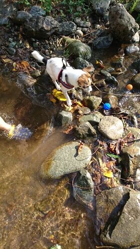 昨日はアジ仲間に誘われて青山親水公園へ。 公園脇には道志川が流れています。 今日水位もなく川でもよかったのですが、かなづちおひめさま。 山から湧き水がたまる小さな水溜まりでボールでつって水遊び。 ボール命なの。ボールのために頑張るの。 湧水なの…