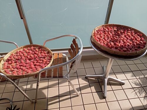 朝のうちはお日様が雲に隠れてちーと心配しましたが、お昼前にはあちちっくらいの天気に。 昨日で土用干し2日目も無事終了。 優しく裏返したつもりでも完熟した梅は皮が薄く、破れてしまったのも。 まっやむなし。 瓶に詰めたら年明けまで放置だから問題なし…