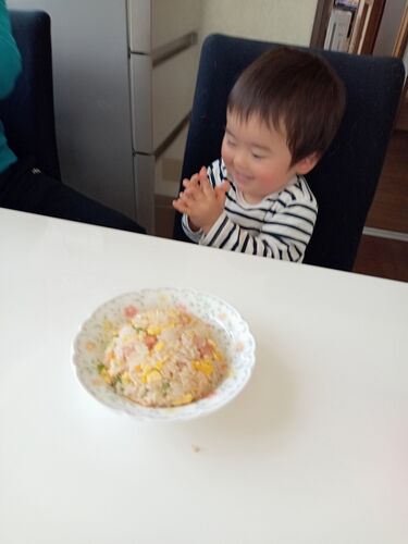 微熱が夜は結構な発熱となりカロナール処方。 大汗かいて下がりました。慣れない子守のせいかしらん。 2号夫婦が名古屋に向かい午前中はお利口さん。 お昼の炒飯も美味しいポーズをして完食です。 さーてお昼寝と部屋を暗くしても寝ません。 そして眠いのに…