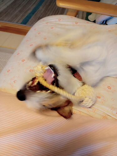 み~とゆめ。 よく遊びます。 まっみ~が遊んであげてるですけどね。 引っ張りこ大好き。玩具が音が出るなら白熱します。 力では大きくなったゆめに負けるのですが、そこはみ~ちゃん。 頭使いますよ。 相手をねじ伏せ、首をつかって相手の力を弱めます。 体…