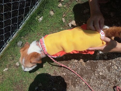 ゆめのクールウェアのオピタノ、やはりちーと大き過ぎました。 そこで困った時のダンママ頼み、お直しを依頼。 1回ランで採寸してもらい、仮縫いしたからと布を切る前に最終確認。 モデルはゆめこさん。 裏返しで着てもらい微調整。 私だったらすぐハサミ入…